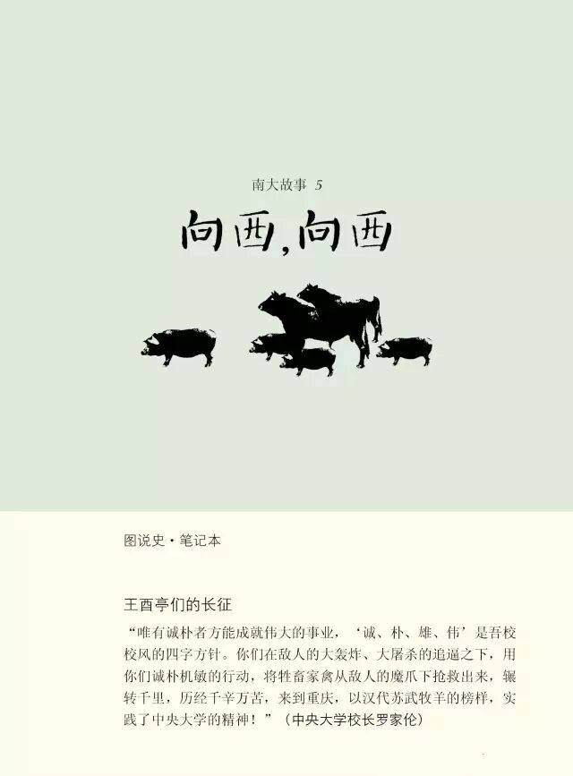 曾几何时,抗日的烽火蔓延至金陵古都,南京大学的前身中央大学和金陵大学被迫踏上了西迁的漫漫征途。这其中的故事,可歌可泣可圈可点的太多。为中央大学西迁做出重大贡献的罗家伦校长曾经评价中大西迁中的一次壮举“以汉代苏武牧羊的榜样,实践了中央大学的精神”——那就是心怀“诚朴雄伟”的王酉亭们带领下的中大牲畜家禽的西迁。《向西,向西》正是杨老师用图说史的抽象方式融入南大人文精神的匠心之作。